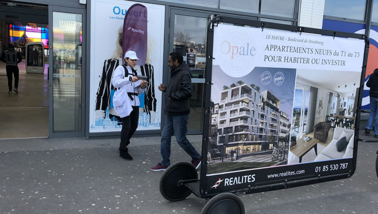 Le Groupe Réalités affiche sa nouvelle résidence Opale au Havre sur Bike’Com® XXL, marque ainsi les esprits dans la proximité, entame le dialogue avec les locaux et laisse une trace via des flyers en street marketing.