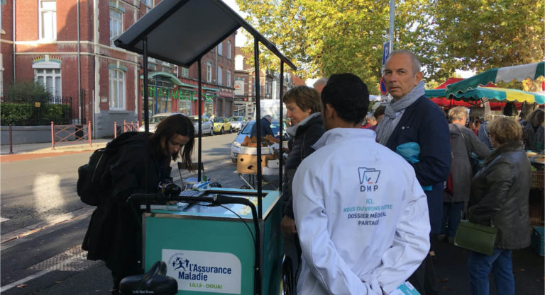 La CPAM de Lille Douai met en avant son carnet de santé 2.0 à l’aide d’une solution de communication en triporteur.