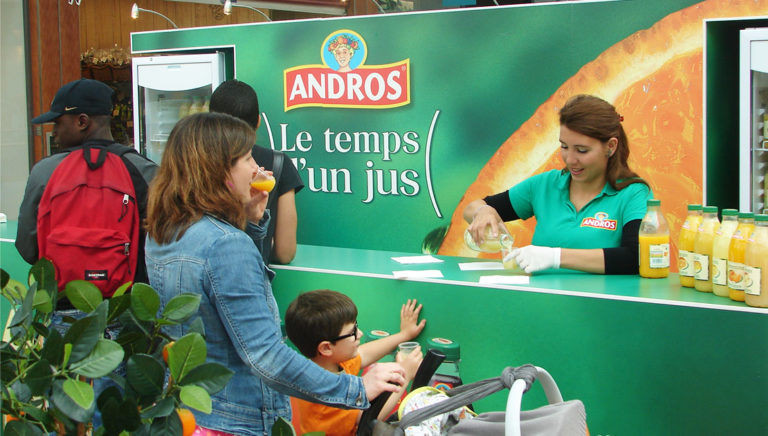 Pour augmenter sa visibilité et acquérir de nouveaux consommateurs, Andros propose de déguster ses jus de fruits dans les centres commerciaux parisiens avec un bar à jus éphémère créé pour l’occasion.