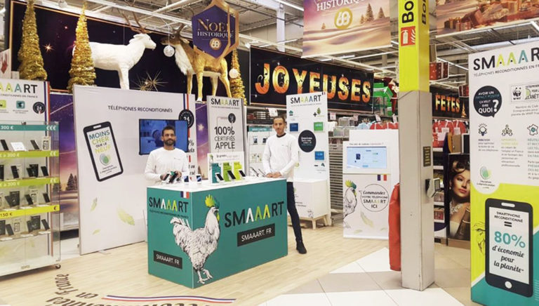 SMAAART Débarque chez Carrefour avec son pop up store en entrée de magasin pour faire découvrir sa marque de téléphones reconditionnés.