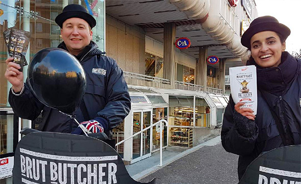 Les segways logotypés donnent de la hauteur aux hôtesses événementielles, qui, habillées aux couleurs de Brut Butcher distribuent les flyers informatifs aux passants de la zone de chalandise.