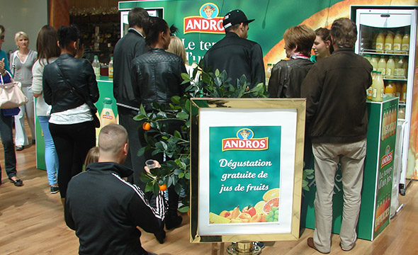 Pour augmenter sa visibilité et acquérir de nouveaux consommateurs, Andros propose de déguster ses jus de fruits dans les centres commerciaux parisiens. Un bar à jus éphémère a été crée pour l’occasion.
